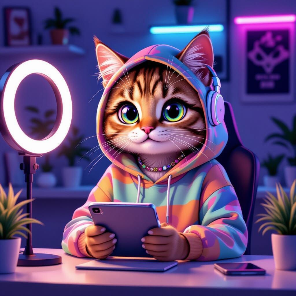 This image shows a Gen Z cat influencer in a vibrant hoodie working at a modern desk in a cozy bedroom studio, complete with tech accessories and neon lighting. The image is rendered in a hyper-realistic style with intricate details.