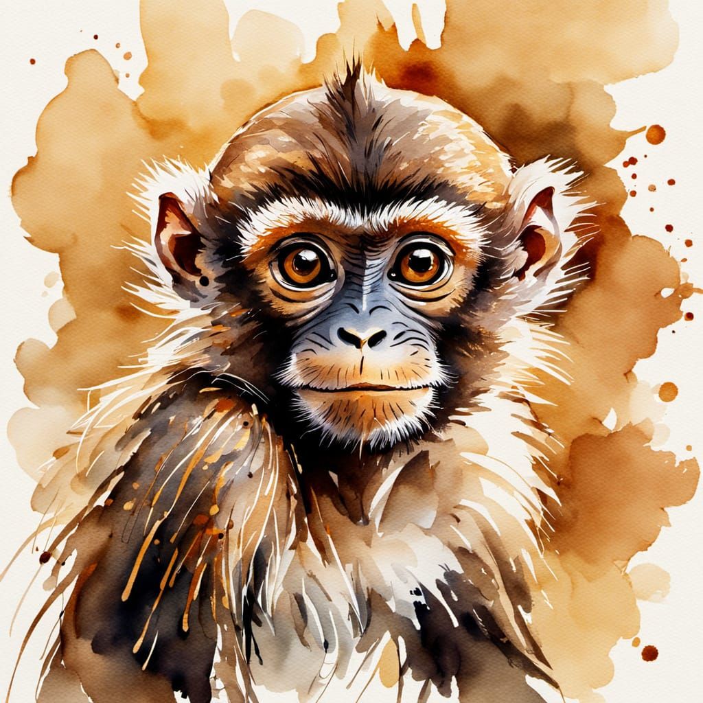 European ink painting. Close-up portrait. Small brown monkey perched on the tip of a finger. Macro photography. Expressive brushstrokes. Whimsical facial expression. Delicate finger texture. Warm, golden lighting. Best quality. Detailed illustration. Intricate lines. Watercolor textures. Hand-painted ...
