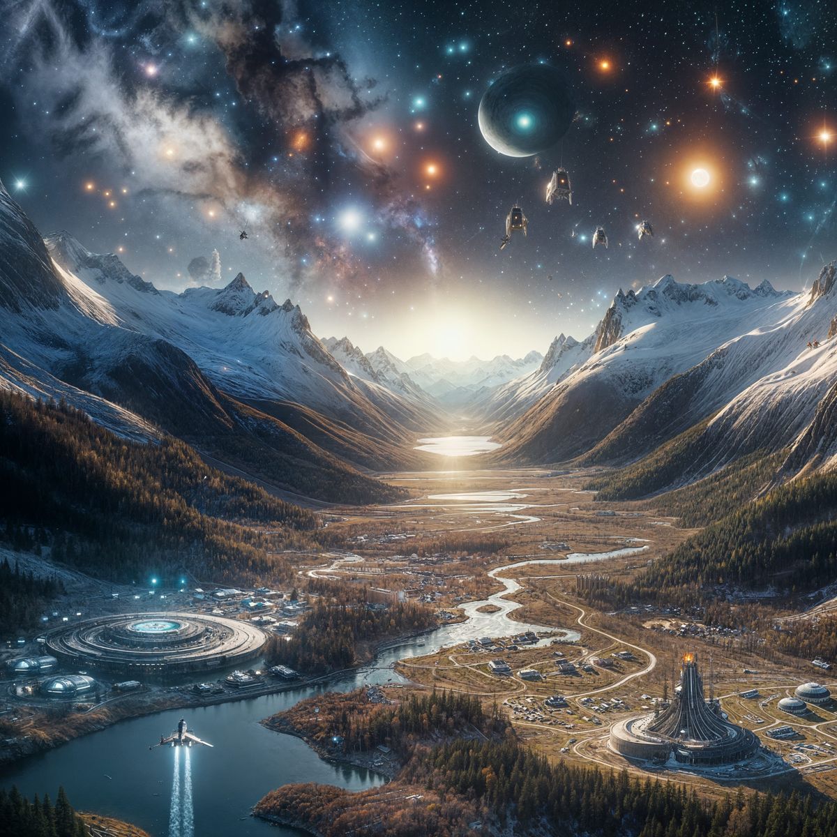 A breathtaking bird's eye view of a mountain valley with an alien base. The matte painting-style digital artwork features snow-capped peaks, a lake, alien spacecraft, and a vibrant, star-filled sky.