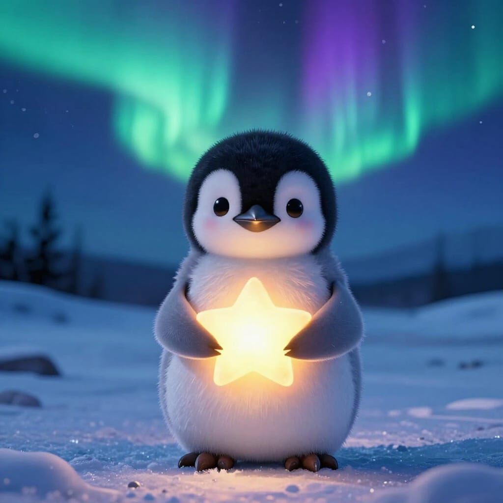 This image showcases a photorealistic 3D render of a tiny, fluffy baby penguin holding a bright star under a vibrant aurora borealis. The scene features cinematic lighting and high detail, creating a magical night landscape.