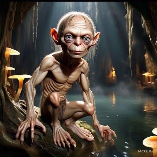 This image shows a close-up portrait of a dark lord's servant, Gollum, holding a precious ring in a dark cave. Muted earthy tones and golden light create a moody atmosphere with subtle textures and mysterious shadows.