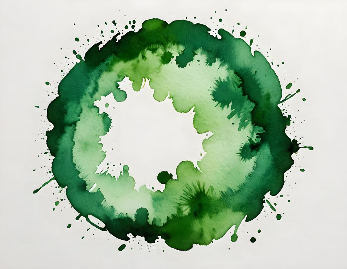 This image shows a green watercolor stain ring isolated against a white background. The simple composition highlights the texture and color variations within the watercolor mark.