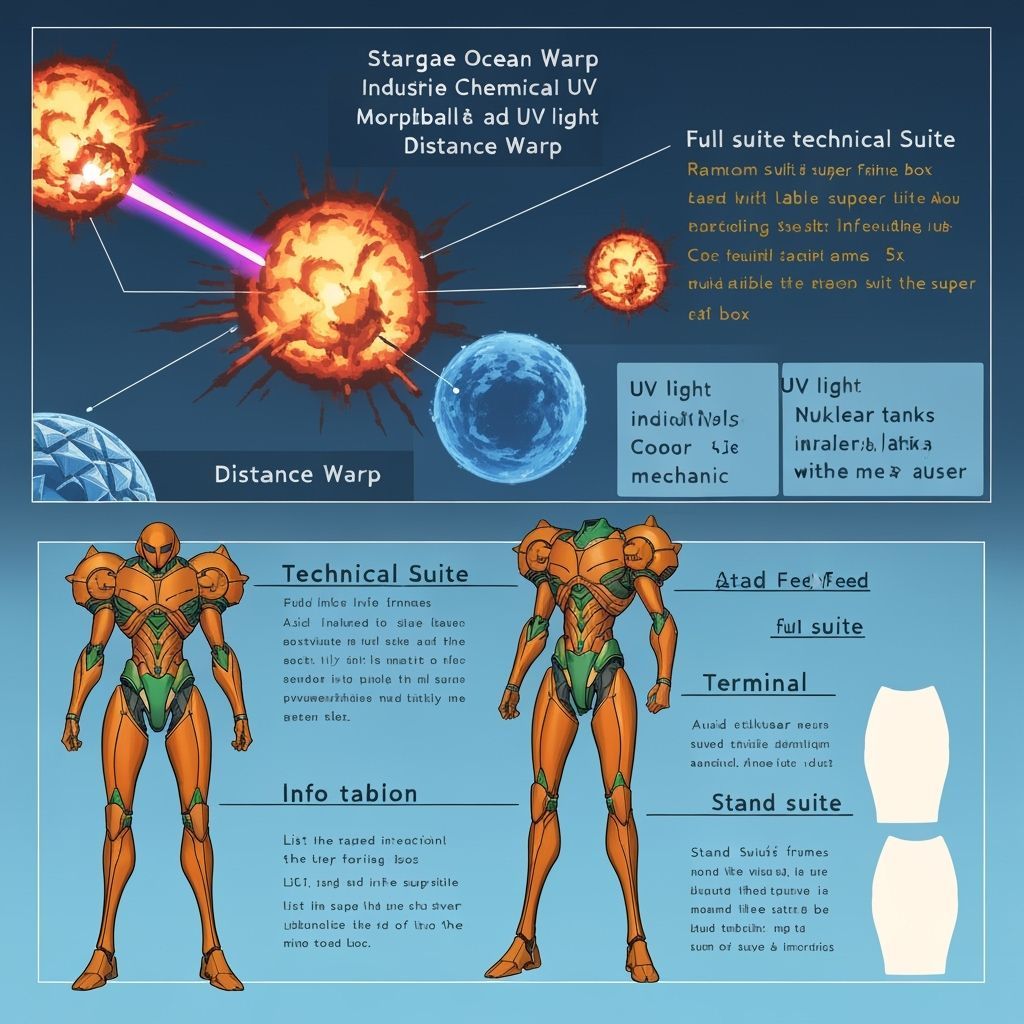 A vibrant image featuring a stargate ocean warp with morphball explosions and UV light beams. It depicts a futuristic industrial scene with chemical and nuclear tanks, reminiscent of a Metroid Prime setting.