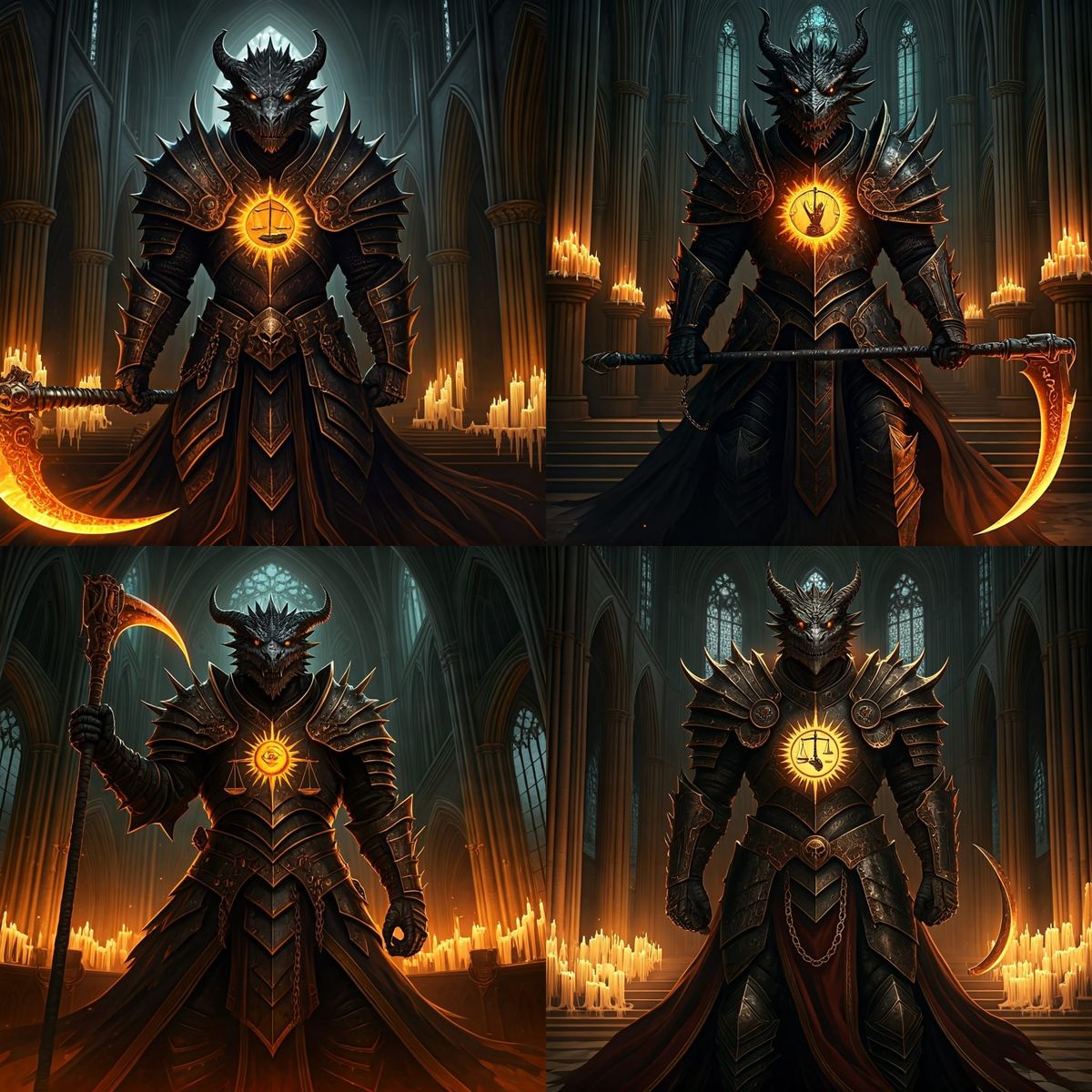This image shows a formidable dragonborn death cleric in a gothic cathedral. He is clad in black and gold armor and wields a runic scythe, surrounded by candles and shadows, in a baroque style.