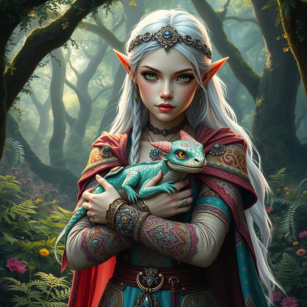 This image depicts a serene elf woman with porcelain skin and piercing emerald eyes, surrounded by a lush forest. She wears intricately detailed, Celtic-inspired clothing and ornate jewellery, cradling a baby dragon with shimmering pastel scales and endearing eyes. The scene is bathed in soft, dappled li...