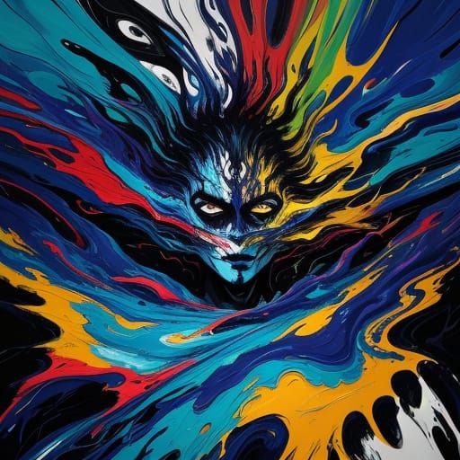 This abstract expressionist artwork depicts a woman's fear through clashing vibrant colors, flowing lines, and chaotic brushstrokes suggesting intense inner turmoil and unease.