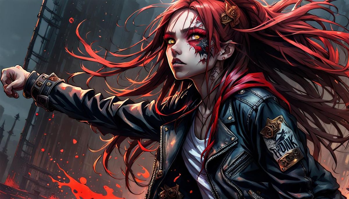 This image shows a small punk girl with red hair, tattoos, and a leather jacket. The artwork is hyperrealistic with a splash art style, reminiscent of anime and manga art.