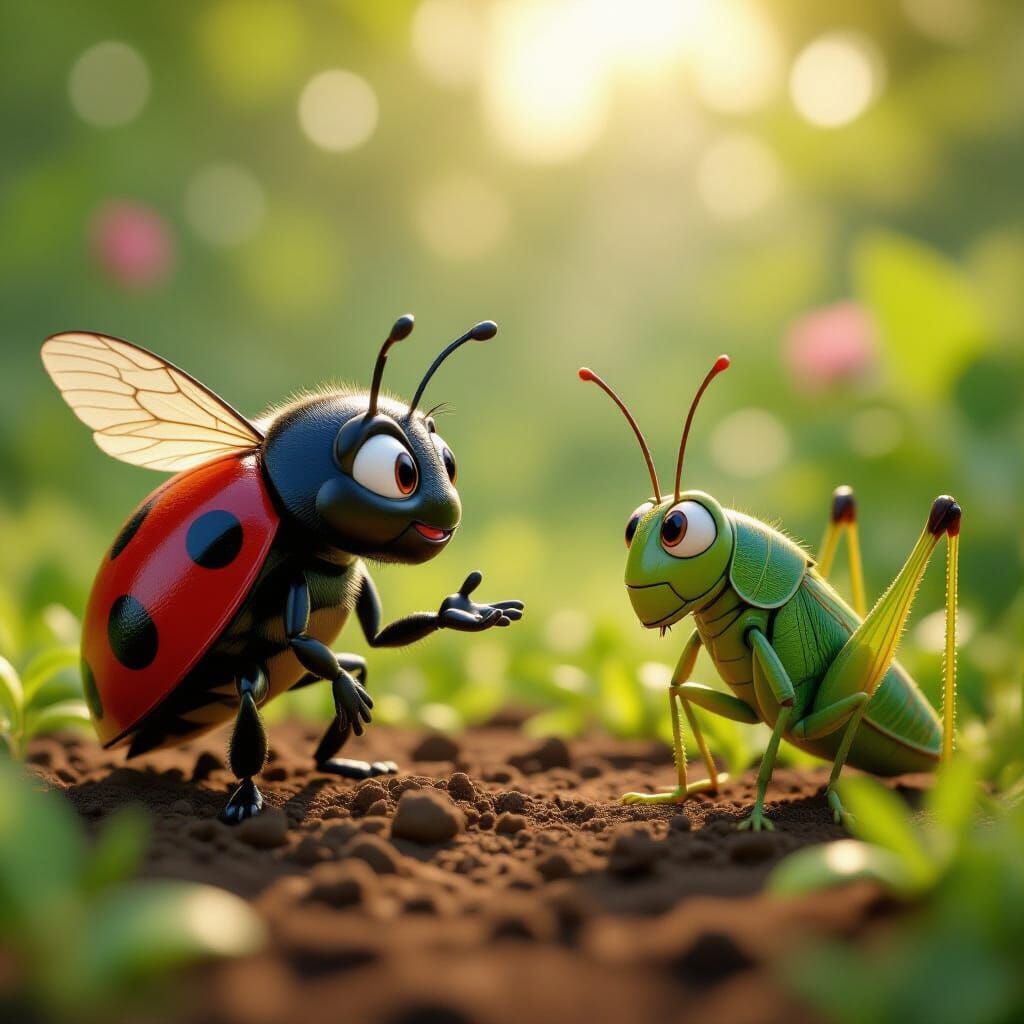 A charming 3D animation still featuring a ladybug and grasshopper in a lush garden. The image captures a serious conversation with detailed textures and cinematic lighting.