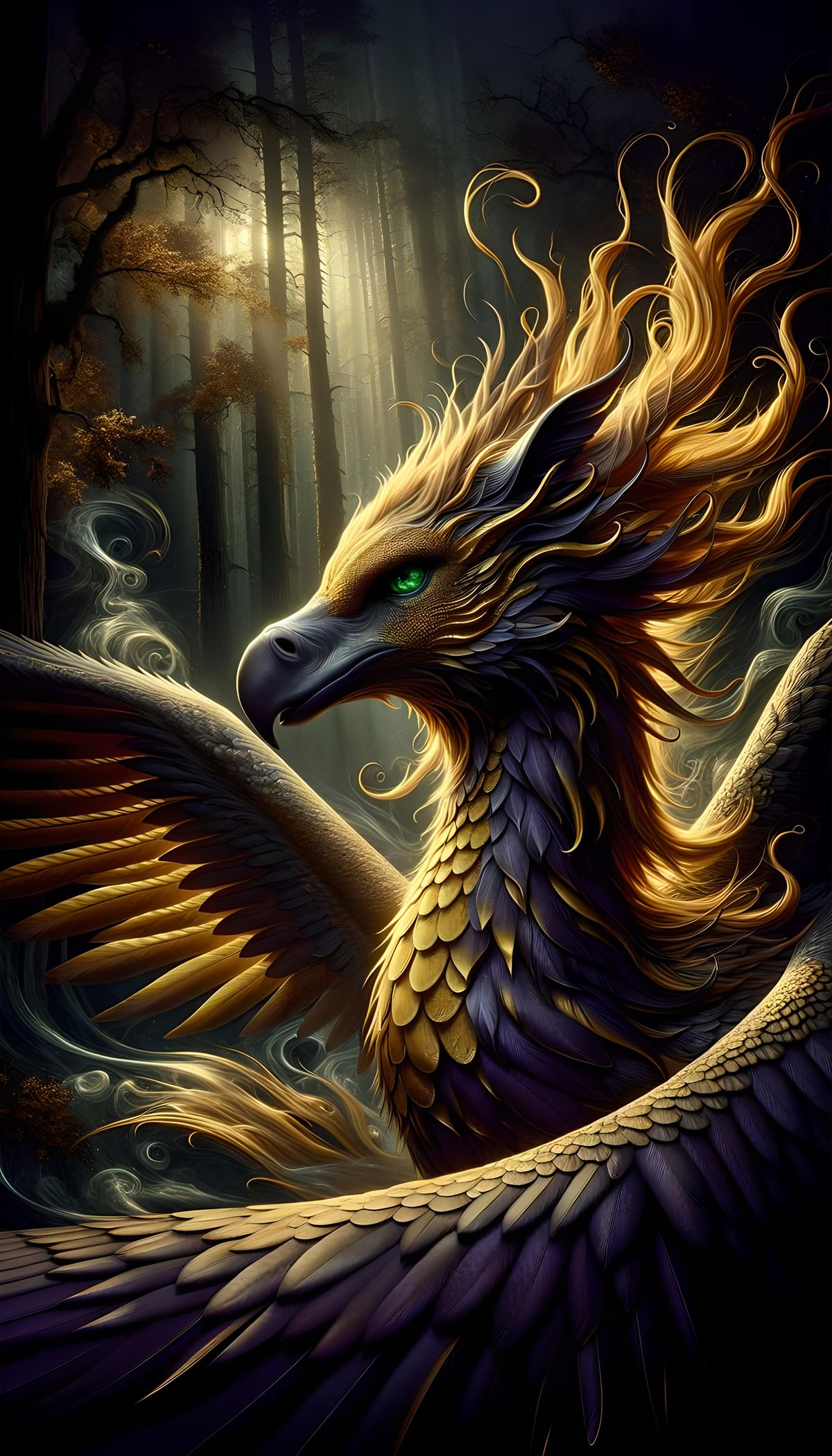 A striking picture of a golden hippogriff ready for flight in a misty forest. The artwork showcases hyperrealistic details, a dramatic color palette, and draws inspiration from Art Nouveau and Romanticism.