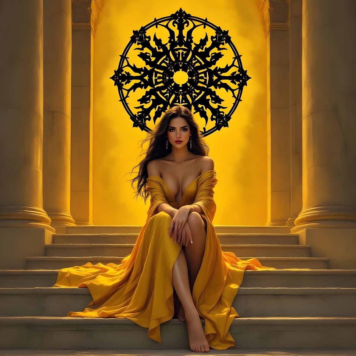 This image shows an elegant woman in golden robes seated on stone steps. A black sigil is displayed above her in this European comic book style illustration with warm golden lighting.