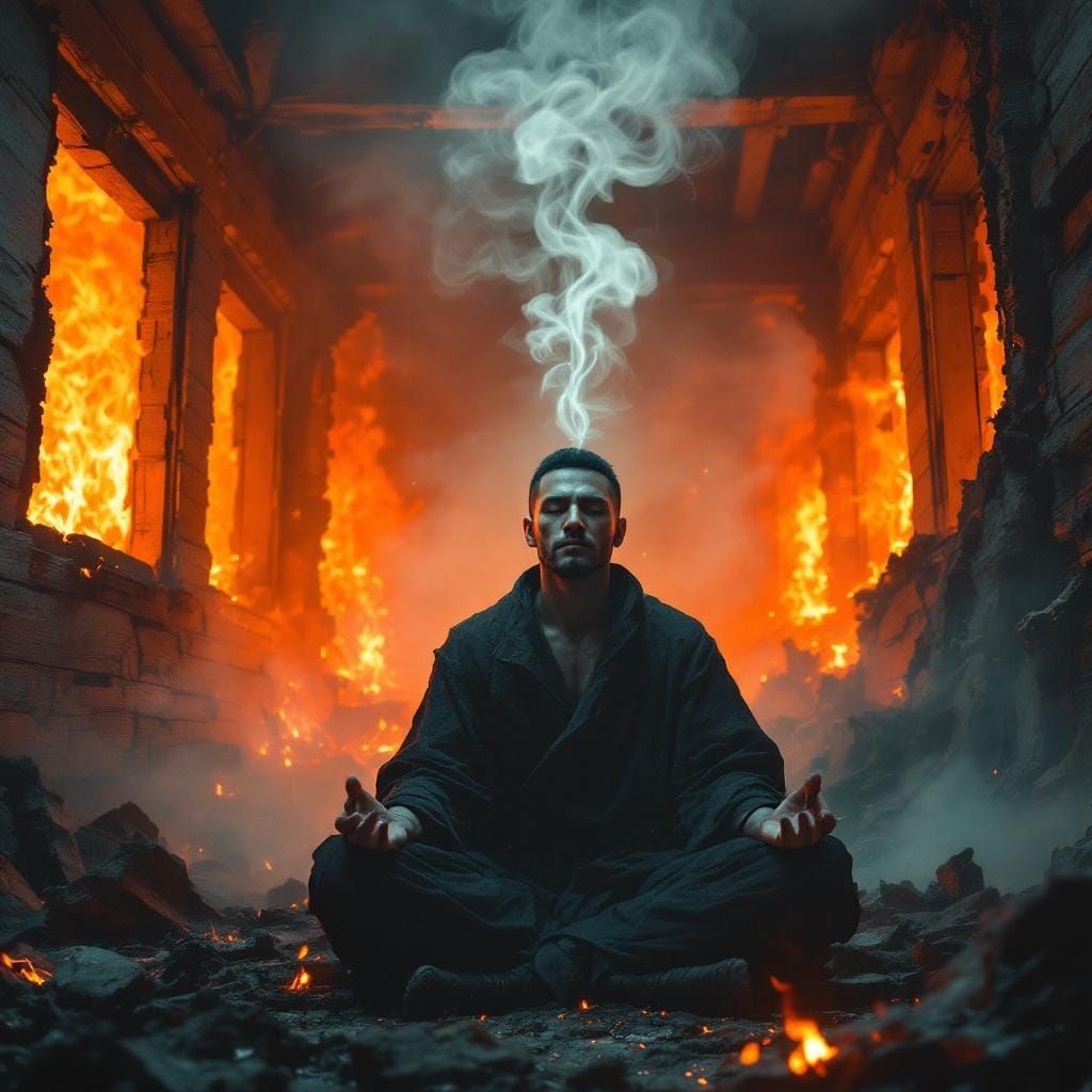 This image shows a man meditating calmly in a burning house, lighting incense despite the chaos. The scene is a surreal, dystopian landscape with twisted structures and eerie biomechanical elements in high resolution.