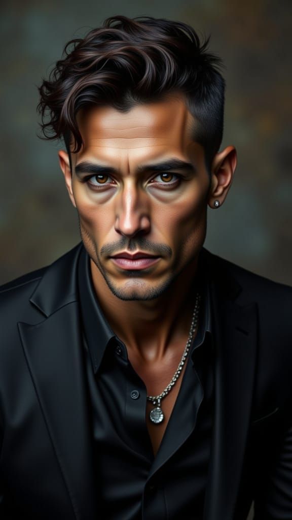 This image shows a lean, athletic Jewish man over 40 in a designer suit, wearing a diamond earring and necklace. The hyperrealistic style captures a moody, resentful atmosphere.