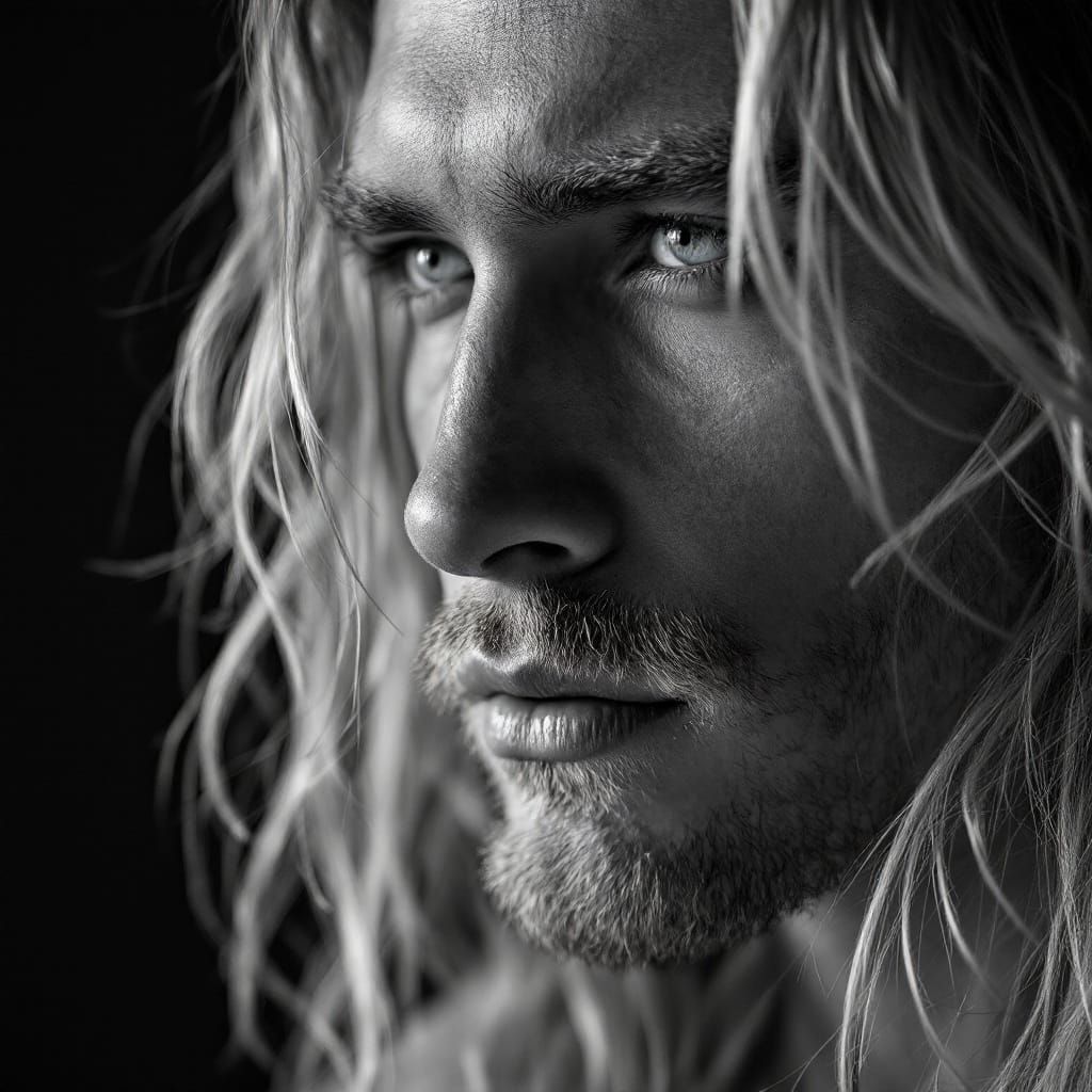 This striking black and white photo captures the refined, masculine features of a young man with long, light-colored hair. The studio portrait highlights the interplay of light and shadow on his face.