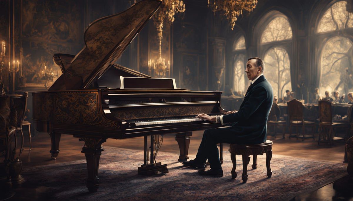 This image depicts a fantastical scene featuring a renowned Russian composer set amidst intricate, detailed environments with deep colors and complementary hues, evoking a sense of opulence and fantasy, as seen in concept art for Unreal Engine 5