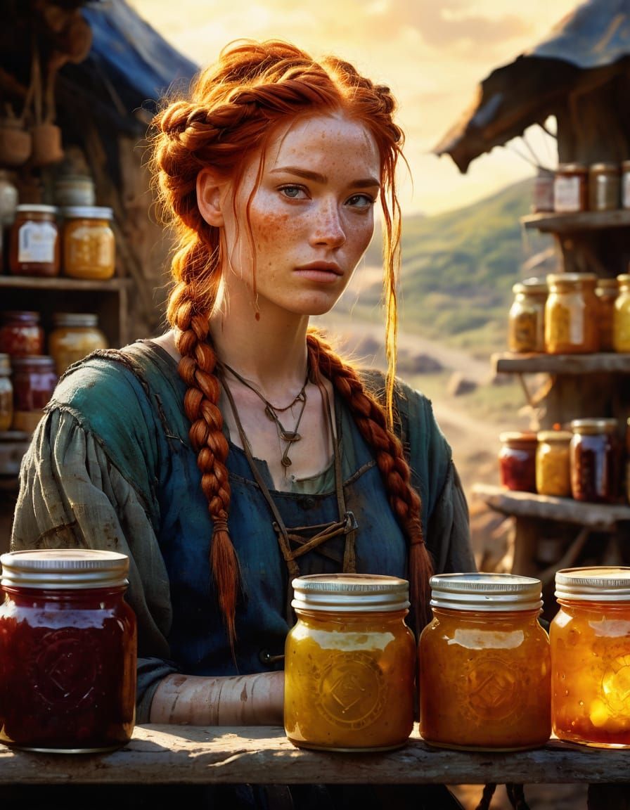 This image shows a close portrait of a young, smiling woman with red hair selling jam at a roadside stand. The artwork features warm, golden lighting and vibrant colors in an abstract expressionist style.