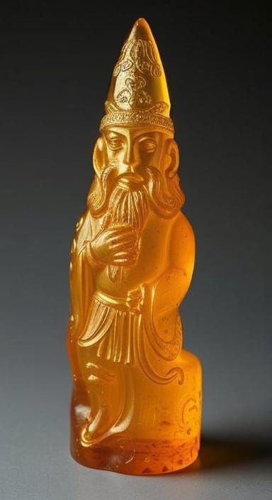 This image shows an amber relic of immense age, hinting at forgotten eldritch horrors. Glowing runes adorn its surface, captured in a dark academia style with a muted, aged aesthetic.