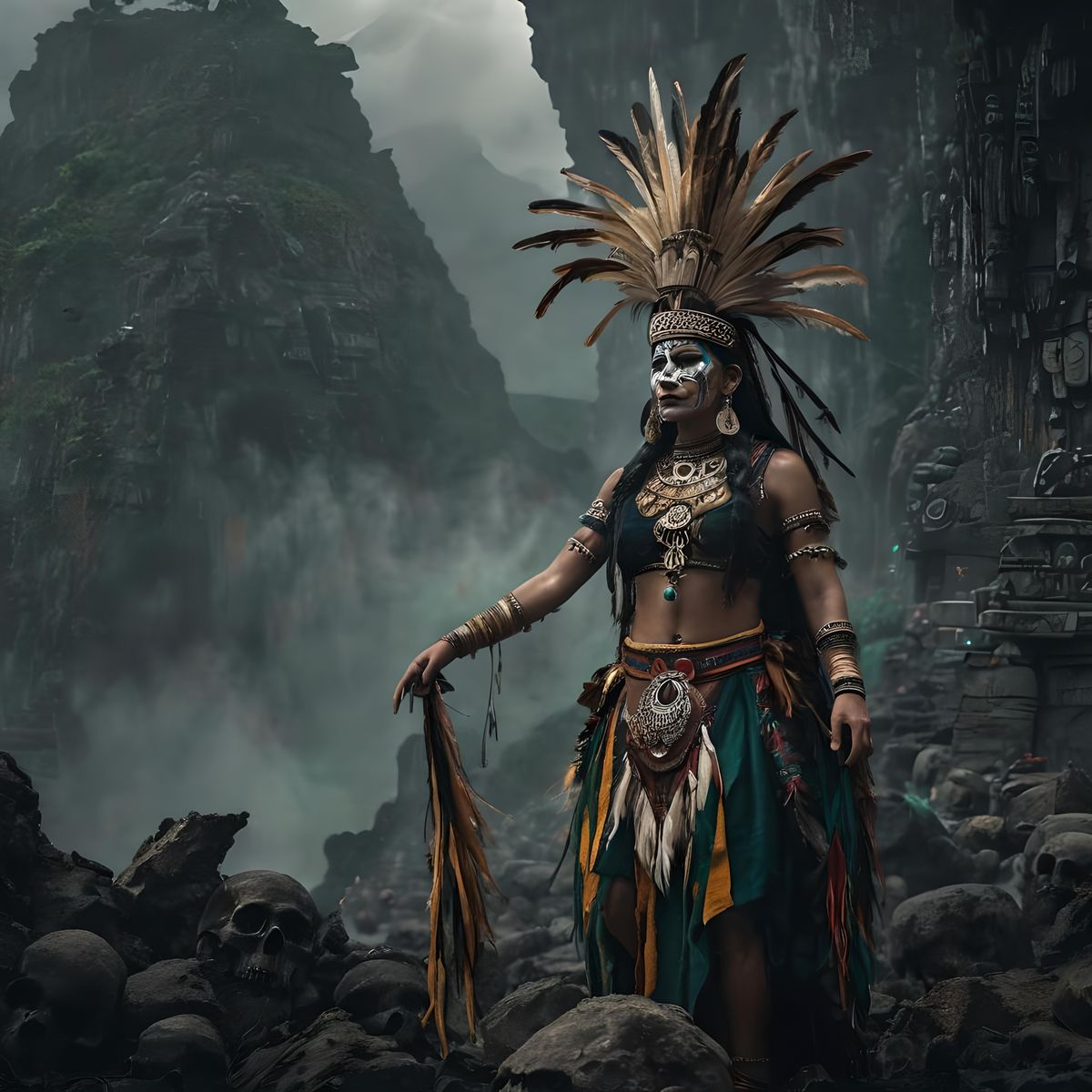 An authentically realistic National Geographic quality (((volcano ceremonial sacrifice scene set atop a wild Mayan mountaintop, a beautifully dressed Mayan maiden is surrounded by a ceremonial ritual))) , in the heart of a dense jungle where a young woman in traditional Mayan clothing is being held by ...