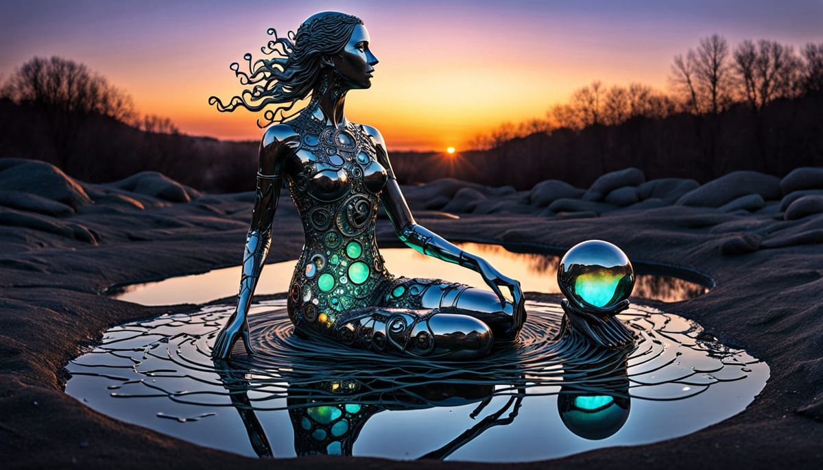 This image showcases a surreal scene of a woman seated within a spiral sculpture. It features intricate silver filigree, bioluminescent elements, and fragmented mirrors, rendered in a dreamlike, vibrant 1970s color print style.