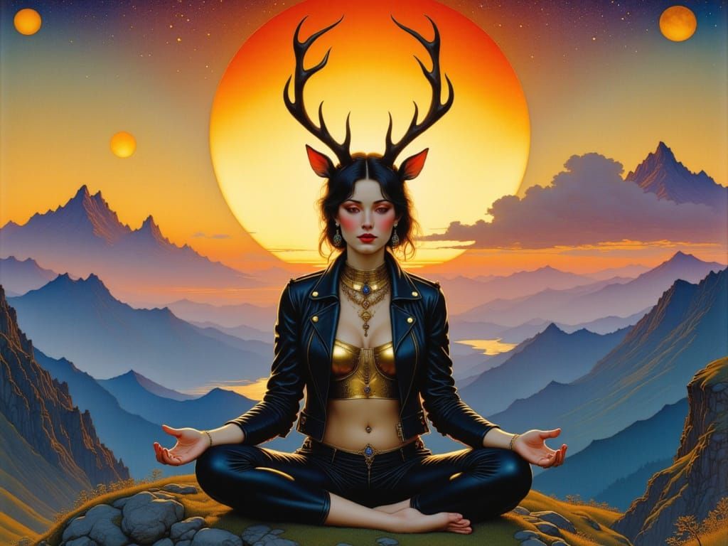 This image shows a beautiful woman with stag antlers, dressed in stylish clothing, sitting in the lotus position on a mountaintop. The artwork is reminiscent of traditional Hindu art, using rich, saturated colors and dynamic lighting.