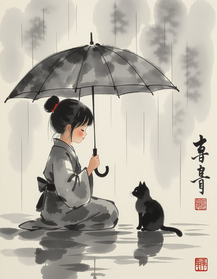 This image captures a minimalist Chinese watercolor scene of a silhouetted girl with her cat, sheltering from the rain under an umbrella. Rendered with delicate brushwork and soft textures, it evokes peaceful solitude.