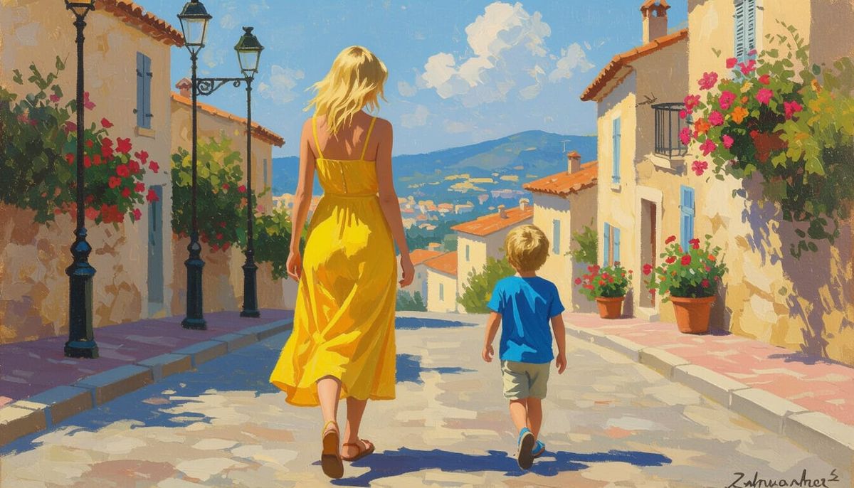 This image shows a blonde woman in a yellow sundress walking down a flower-lined street. A child in blue approaches her, rendered with impressionistic brushstrokes and light.