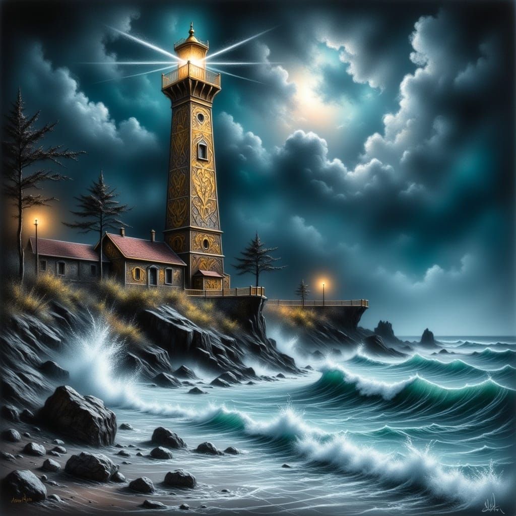 A striking picture of a golden art nouveau lighthouse on a rocky coast. The luminescent beam shines across a turbulent sea under a stormy sky, in a cinematic, dreamlike digital art style.