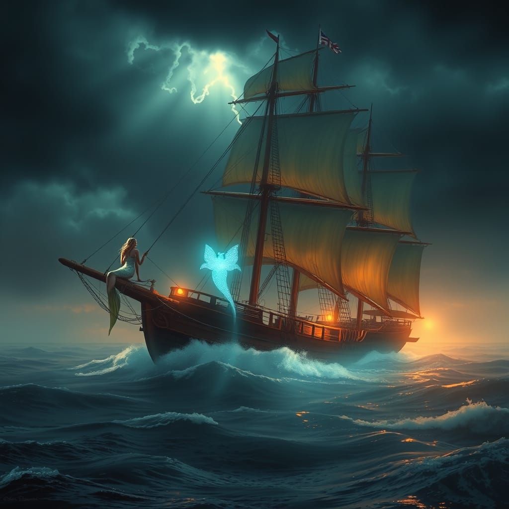 This enchanting image depicts a luminous mermaid surrounded by an ethereal glow, amidst a majestic ship and an ominous sky, blending elements of fantasy and wonder.