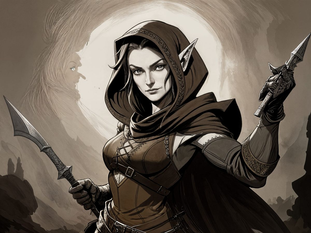 This striking image features a female elf in medieval fantasy rogue attire, rendered in intricate detail with sepia ink drawing techniques, evoking a sense of confidence and drama.