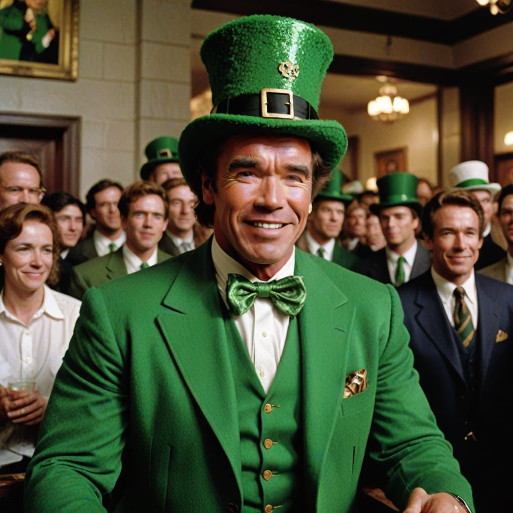 This image shows Arnold Schwarzenegger dressed in a playful leprechaun costume, complete with a bright green coat and hat.