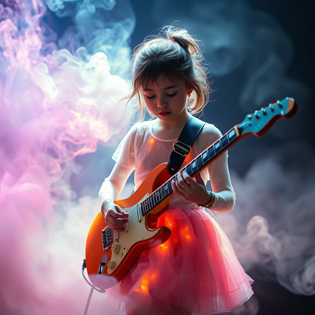 A stunning, cinematic photograph by Mshiffer capturing the essence of a ghostly, smoke-like rock guitarist. The figure, resembling a young girl, is composed of translucent smoke, forming an ethereal, otherworldly presence. She is depicted in mid-strum, her electric guitar emitting a colorful explosion ...