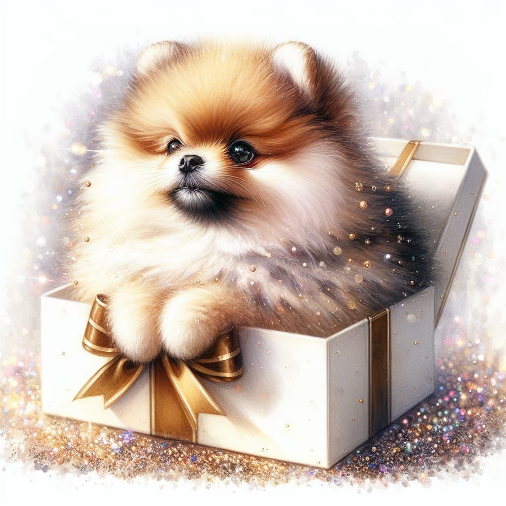 This digital art piece is a stunning depiction of a Pomeranian in a gift box, created in the style of 19th-century Romantic British watercolor painting. The image features soft lighting, colorful illustration, and intricate details, set against a background of sparkling glitter and soft focus.