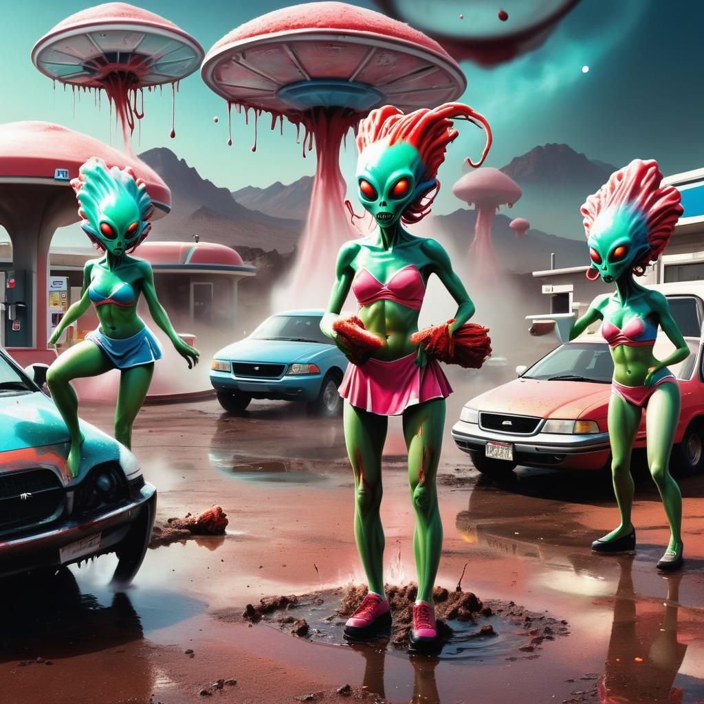 A vivid image of grotesque aliens in cheerleader outfits washing cars at a nightmarish alien gas station. The scene features distorted figures and landscapes in a style reminiscent of surrealist art.