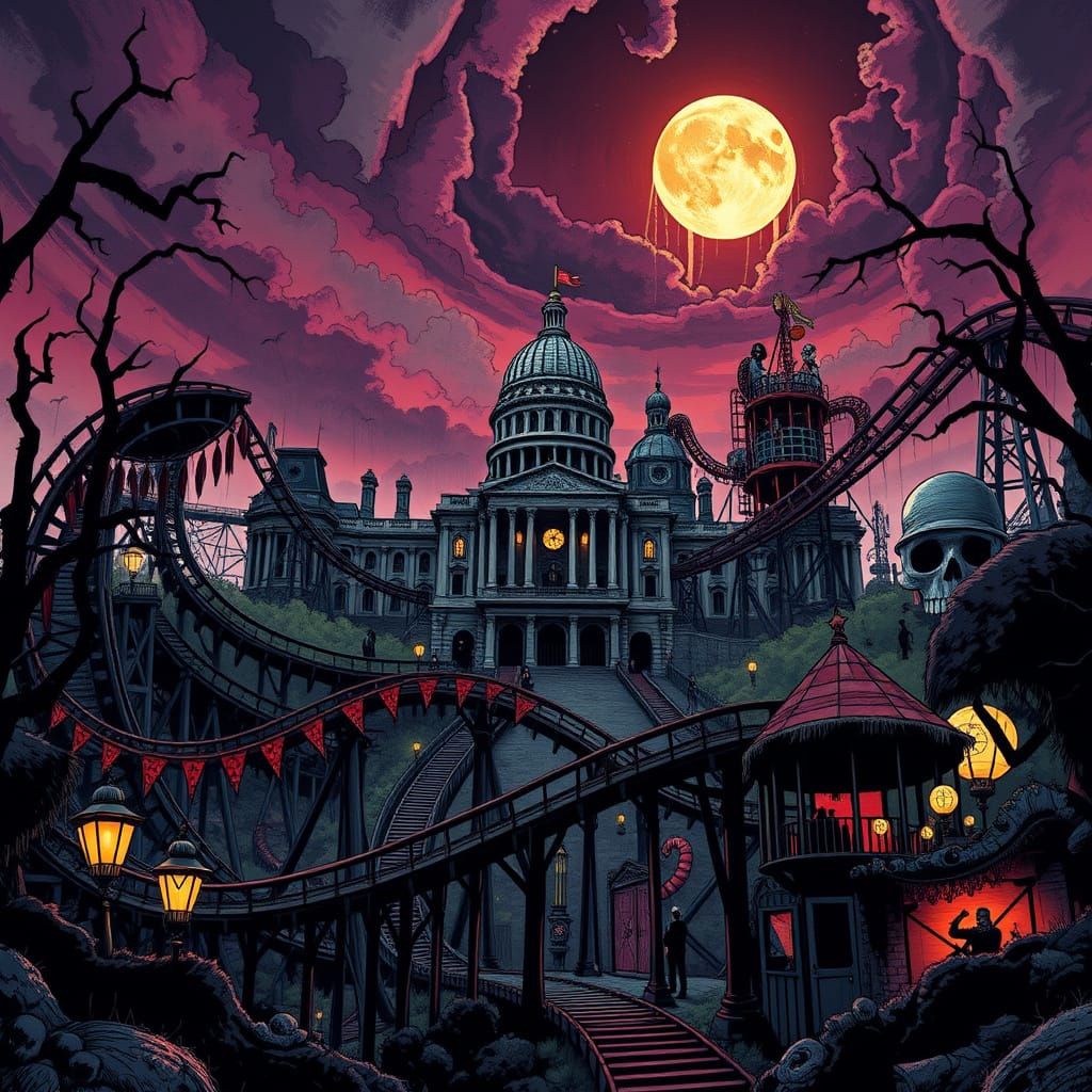 This image depicts a derelict US Capital reimagined as a villain's base, featuring a decaying roller coaster and a haunted funhouse. The art style is gritty comic illustration with gothic and dark carnival elements.