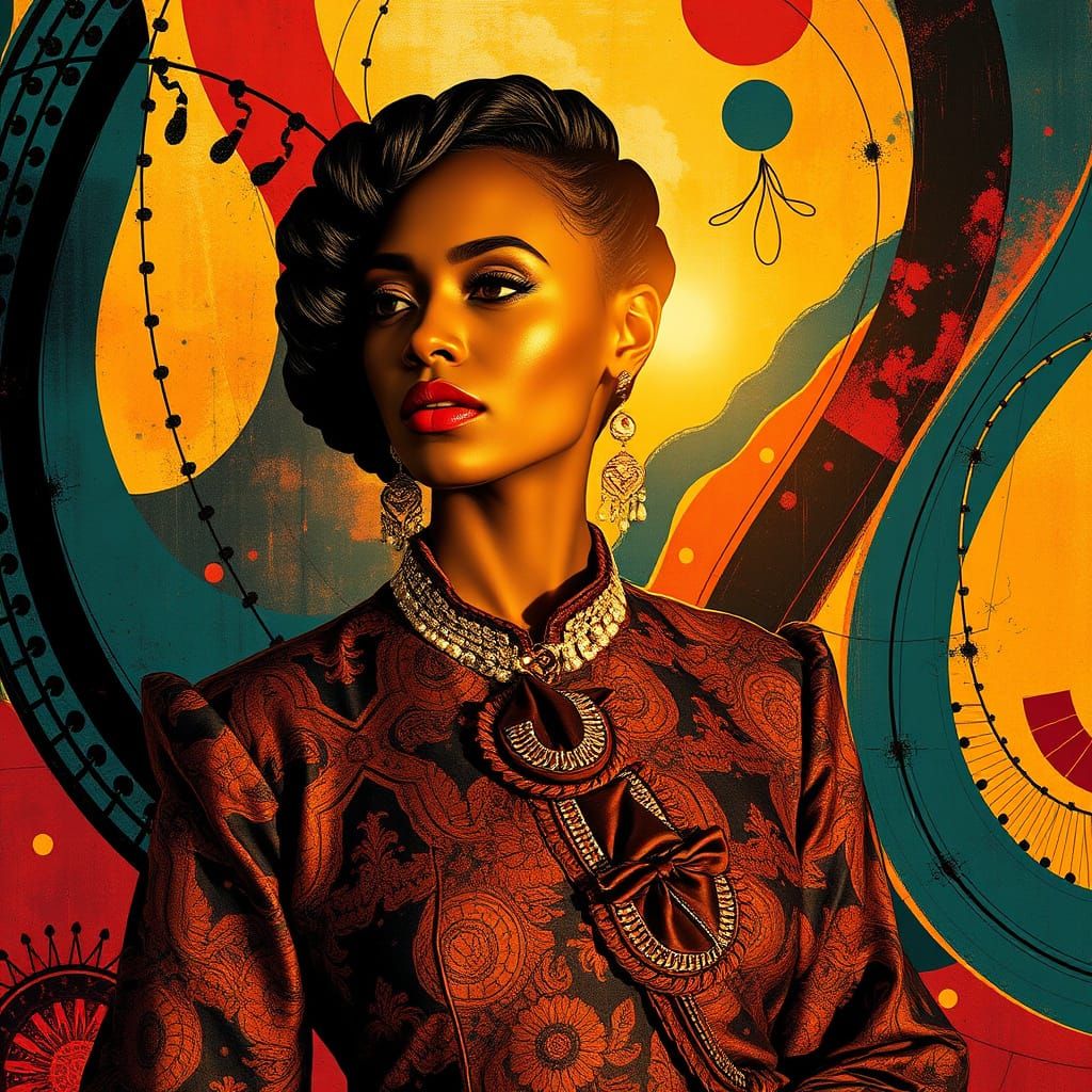 This image showcases an elegant woman wearing a richly textured outfit. The composition is dynamic, featuring bold lines and vibrant color fields, highlighted by golden hour lighting.
