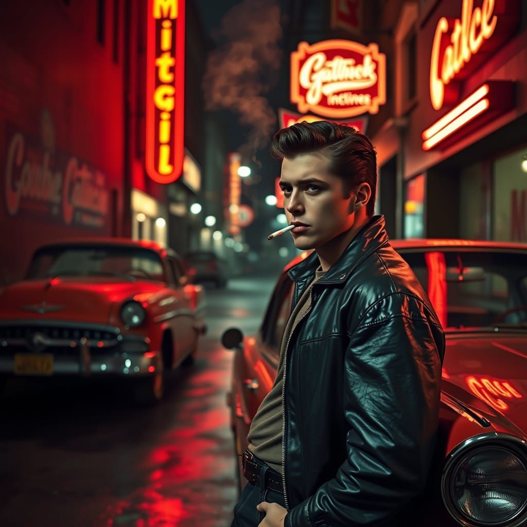 A captivating image of a greaser in a leather jacket leaning against a car. The scene evokes a film noir atmosphere with neon lights and a moody color palette.
