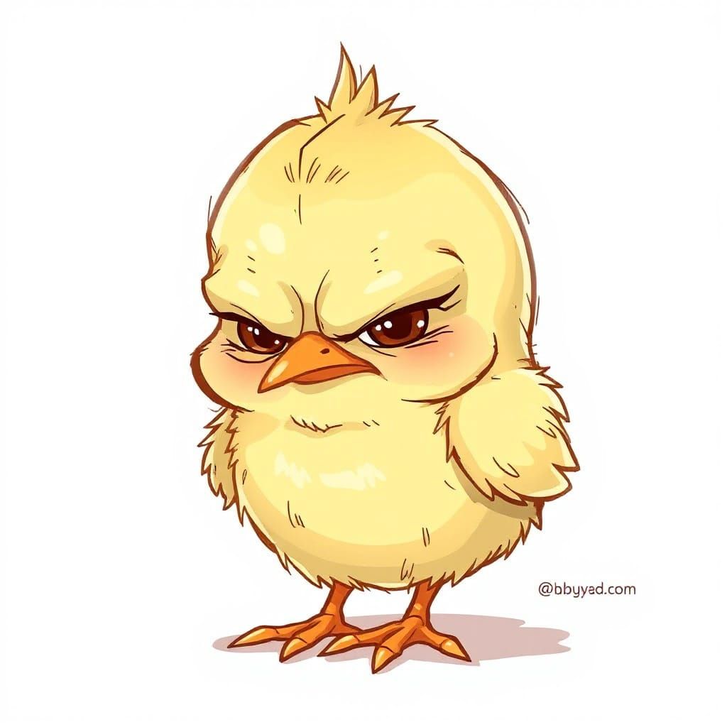 A whimsical caricature of a baby chick scowling with furrowed brow. This image features bold lines, vibrant colors, and exaggerated features in a cartoon style.