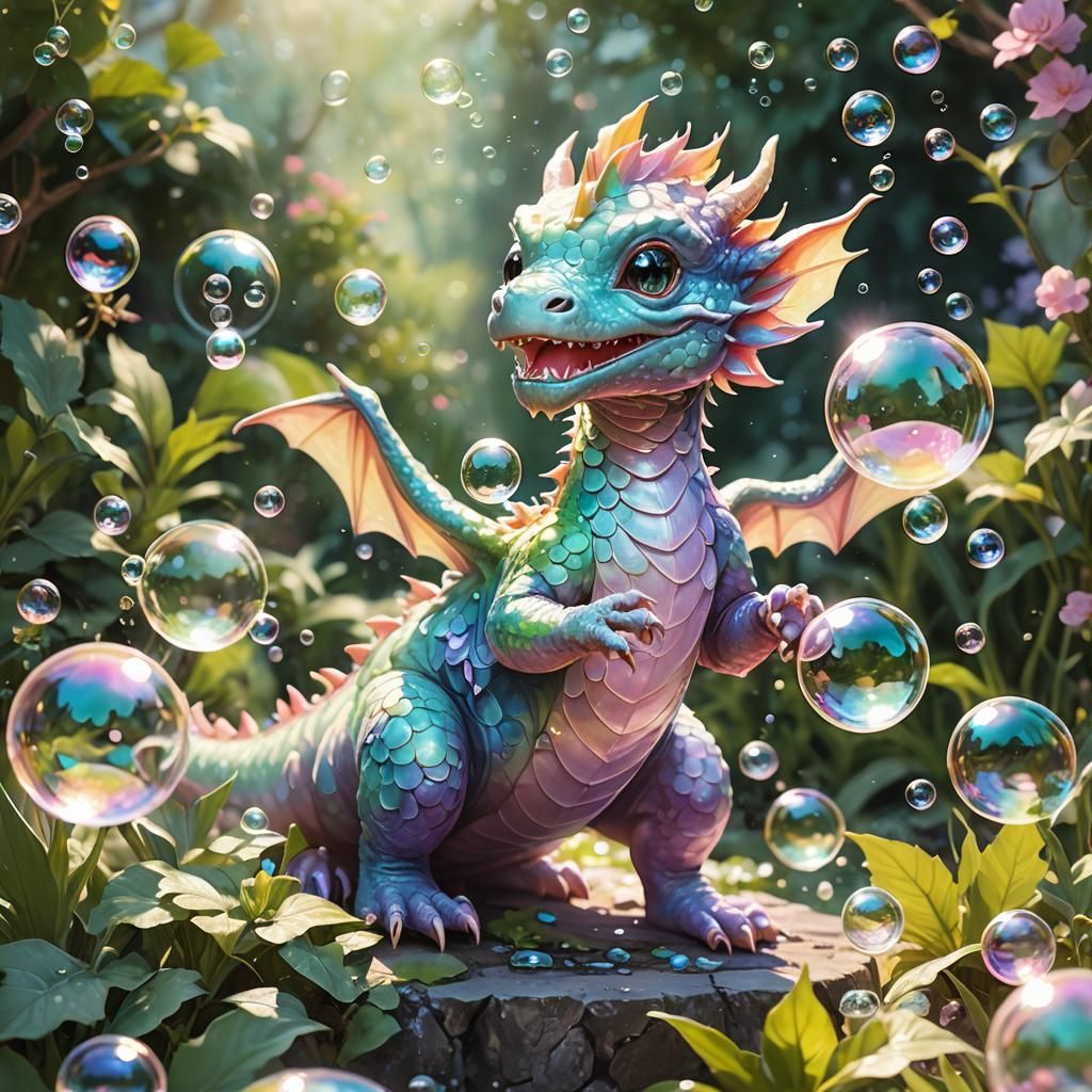 A vibrant splash art image of a baby dragon enjoying bubbles in a whimsical garden. The fantasy illustration features soft brushstrokes, shimmering scales, warm lighting, and a dreamy pastel color palette.