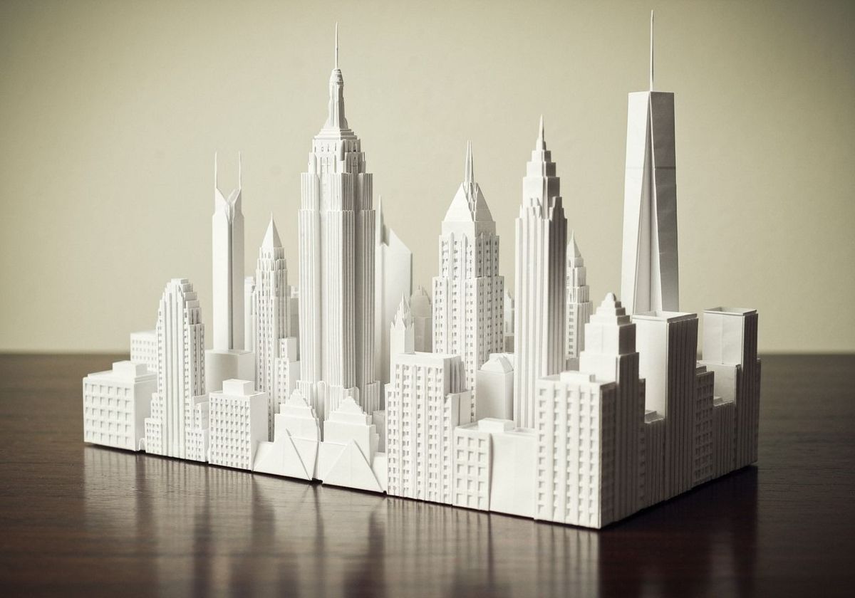 This image shows an origami sculpture of the New York skyline. The intricate details of iconic buildings are visible in the folded white paper, set against a dark wood table with a vintage backdrop.