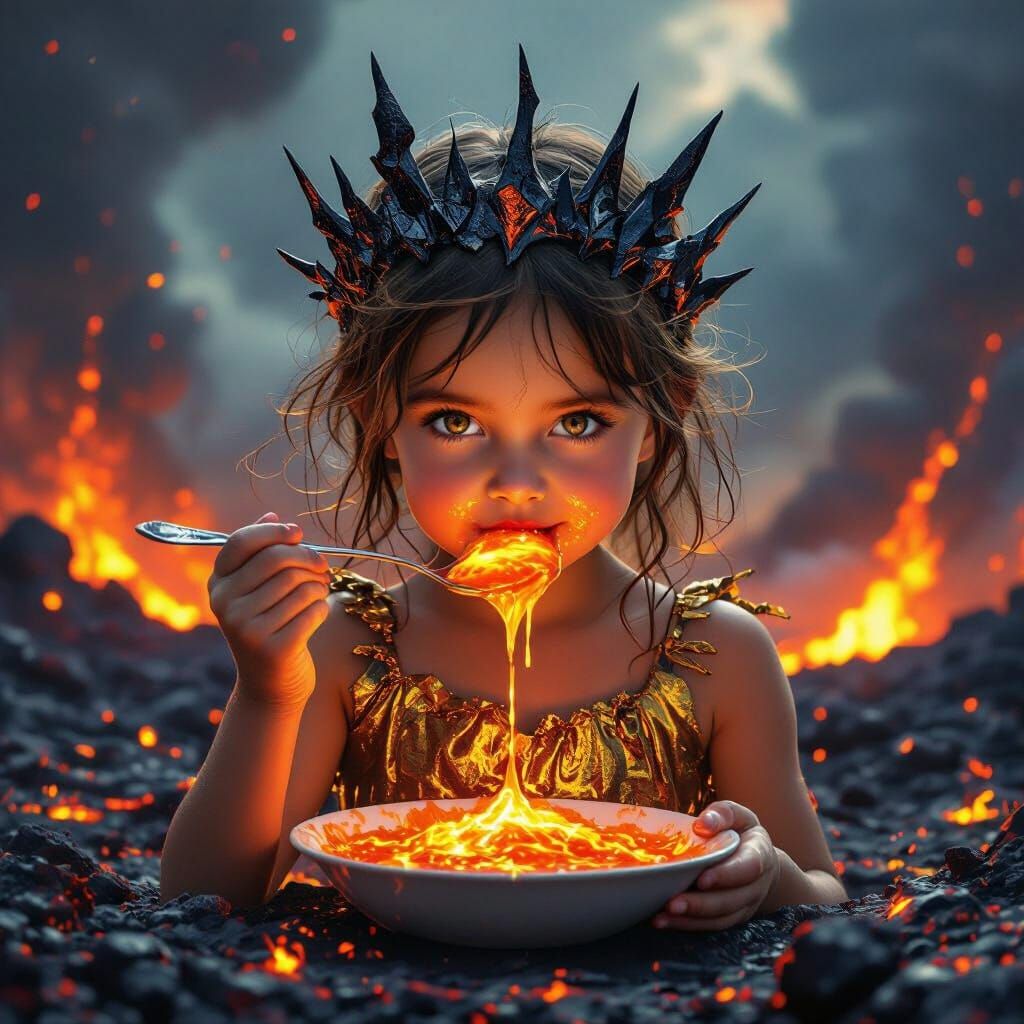 This image depicts a young girl eating glowing lava with a mischievous grin, dressed in molten gold. Set against a fiery volcanic backdrop, it's rendered in a dark fantasy concept art style with dramatic lighting.