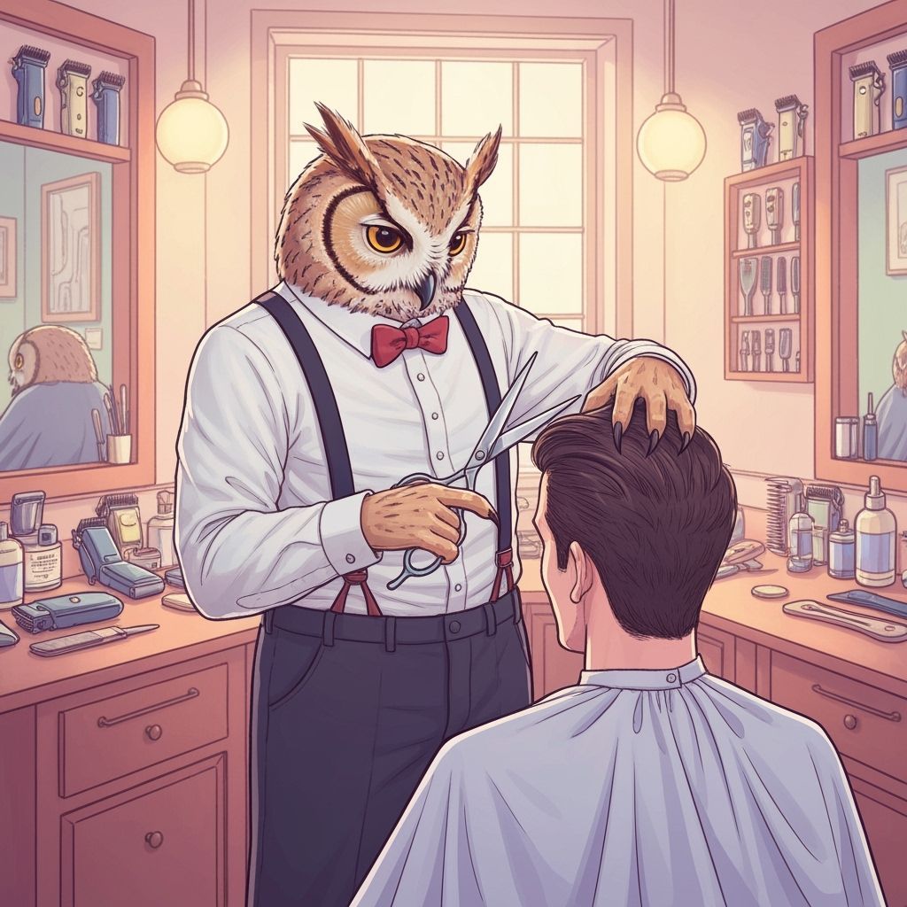 This image shows an owl in a vintage barbershop, expertly cutting a man's hair using ornate scissors. The whimsical scene is filled with traditional tools and bathed in warm pastel colors, reminiscent of vibrant, colorful storybook illustration.