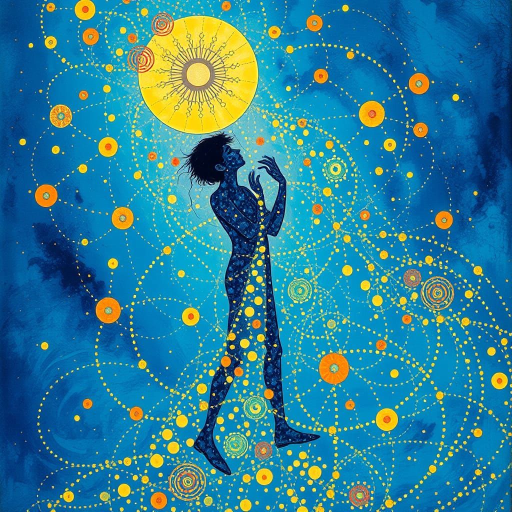 This image features an ethereal man in blue surrounded by whimsical, dreamlike Himalayan blue poppies in a vibrant, intricate, and abstract design reminiscent of Gustave Klimt's style, with delicate, ethereal light and mesmerizing patterns.