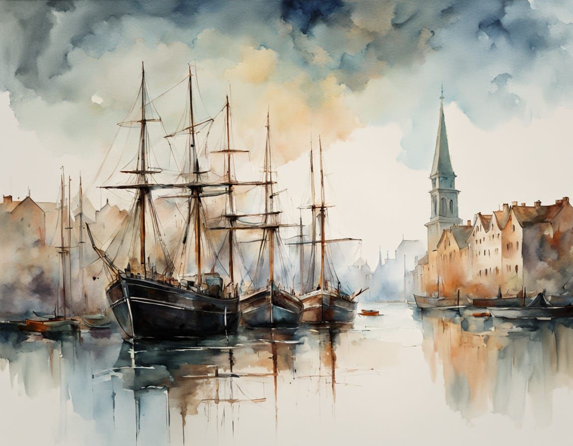 This impressionist watercolor painting captures a serene moment of a woman walking along the old port's edge, surrounded by boats and ships, with majestic churches and weathered buildings in the background. Soft focus and ethereal glow create a dreamy, nostalgic atmosphere.