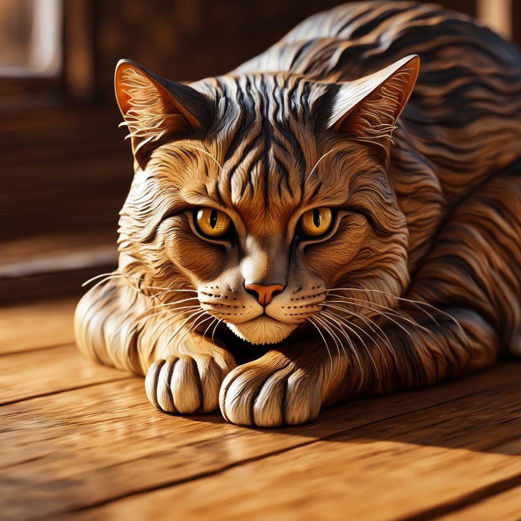 This image shows a hyper-realistic wood sculpture of a cat sitting on a wooden floor. The medium shot captures the detailed texture and intricately carved whiskers, illuminated by warm golden lighting.