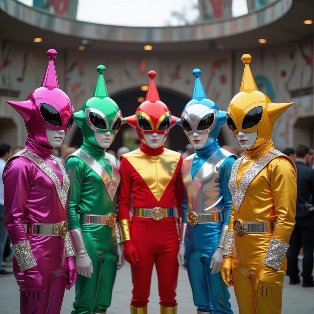 This image shows actors in a retro sci-fi television set. They wear bright alien costumes inspired by 1970s designs, including metallic fabrics and geometric patterns, capturing the era's low-budget space aesthetic.
