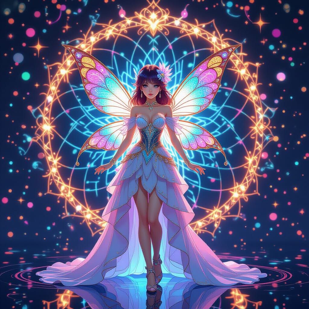 This image shows a beautiful anime-style fairy girl in a dreamlike kaleidoscopic setting. The image features symmetrical patterns and reflections in vibrant sapphire, magenta, amber, turquoise and violet hues, in a surreal artistic style.