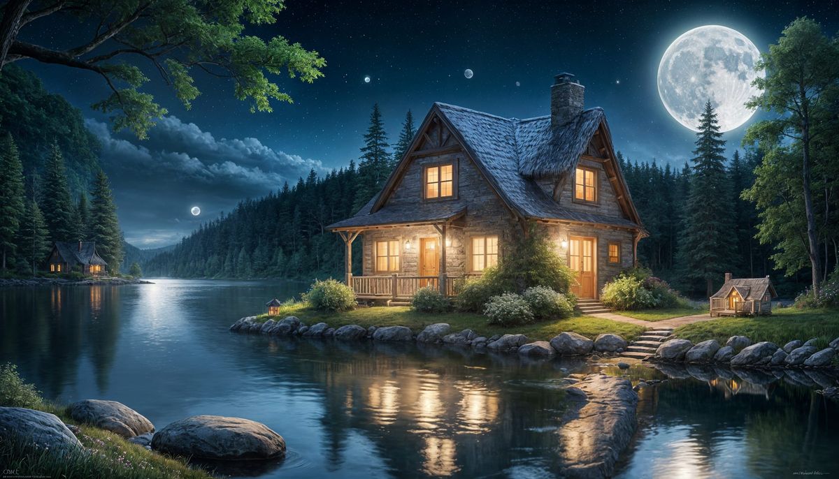 Easily generate your own moonlight cottage images with our free AI image generator. Perfect for artists and designers.