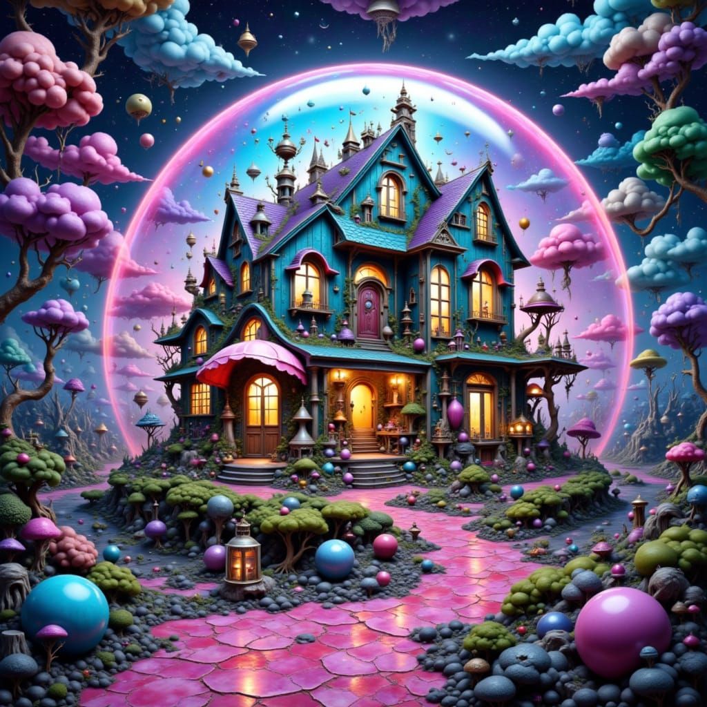 A hyper-detailed 8K image of a home with porches and awnings, built inside a giant iridescent soap bubble in space, lit by neon cyberpunk lights.