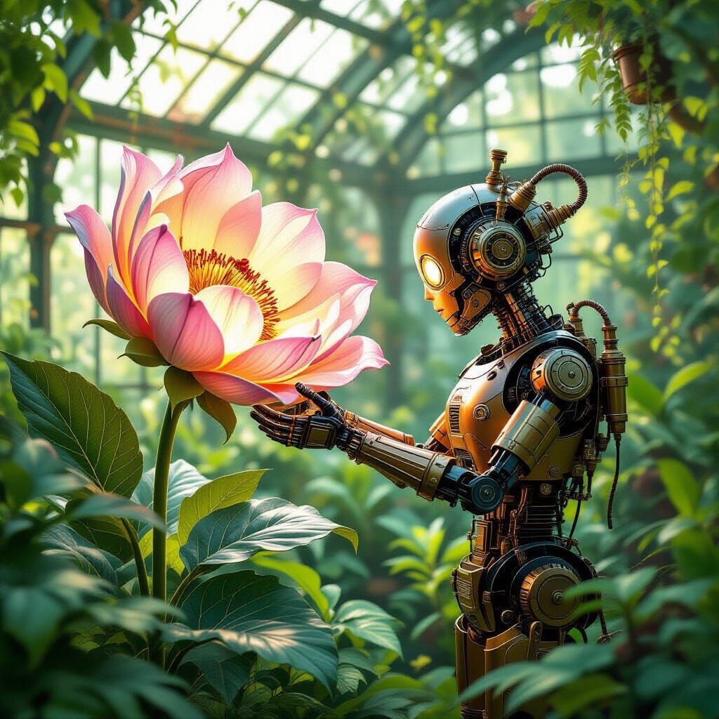 This image shows a whimsical steampunk automaton in a lush greenhouse, caring for an oversized, glowing flower. Rendered in a painterly storybook style with vivid colors and magical realism.