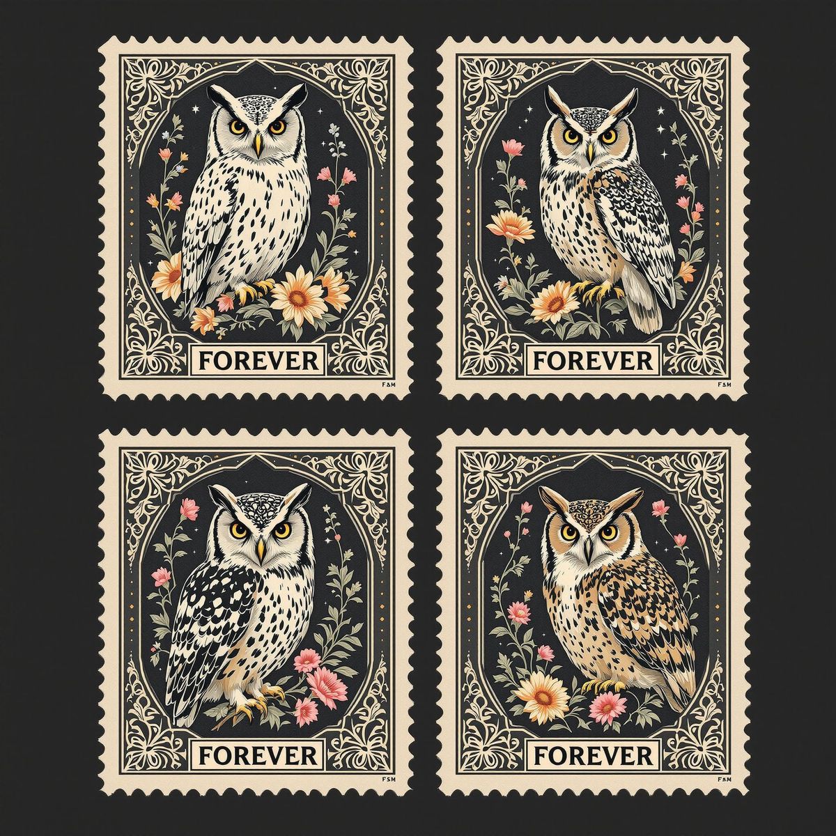 This image displays a set of four vintage postage stamps, each featuring a unique owl and flower. The designs showcase intricate frames and fine line illustrations with triadic colors on a dark background.