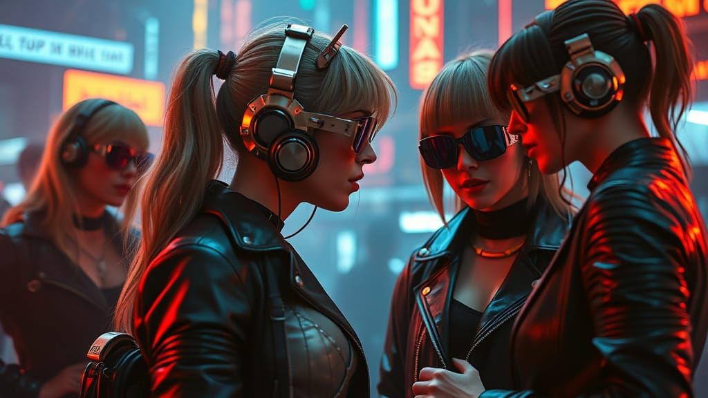 This image shows cyberpunk women talking in a neon-lit street. The art style features chrome augmentations, leather clothing, dramatic lighting, and a shallow depth of field in a cinematic atmosphere.